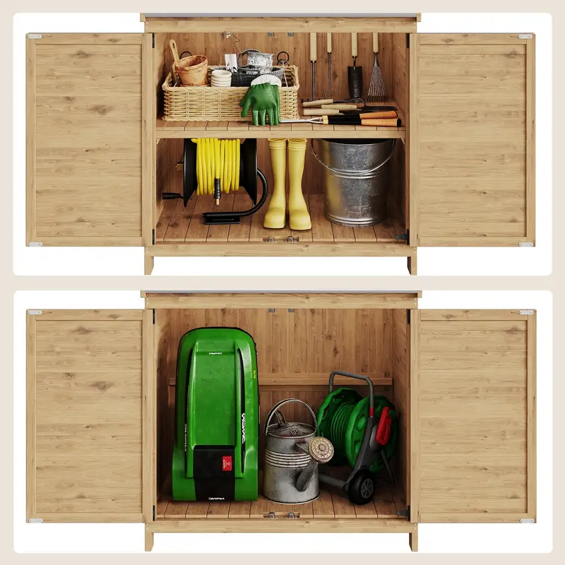 - Material: Hergestellt aus hochwertigem, wetterfestem Material in natürlichen Holz- oder Grautönen, geeignet für den Einsatz im Freien sowie im Innenbereich.